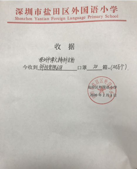 疫情無情人有情,關鍵時刻顯真情。2月3日下午,深圳市博大精科生物科技有限公司相關負責人給深圳市鹽田區教育系統送來了一份特殊的禮物——20萬個一次性防護口罩。
